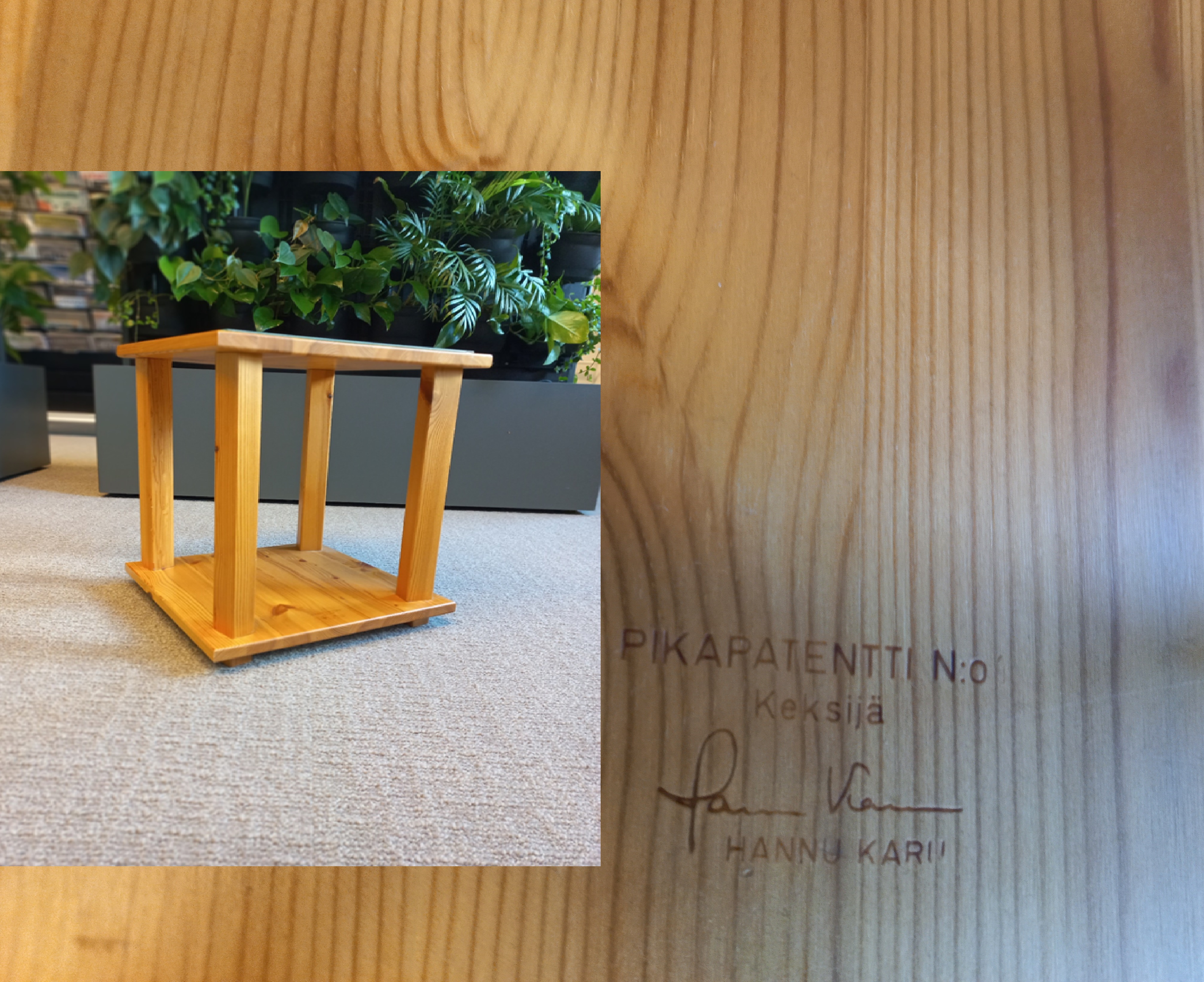Hannu Karun ensimmäinen hyödyllisyysmalli laadittiin patenttitoimistossa. Se on hyvin tyypillinen, vain Suomen markkinaan suuntautuva puusta tehty huonekalu, jota voi käyttää sekä pikkupöytänä että istuimena. Ideana Hannun huonekalussa oli, että se voidaan helposti koota ja purkaa, jolloin sen kuljettaminen mukana (esimerkiksi vappurientoihin) on helppoa ja kätevää. Huonekalun kaupallisesta menestyksestä ei ole tarkkaa tietoa, mutta se tiedetään, että erään suomalaisen patenttitoimiston toimitusjohtaja sai sellaisen lahjaksi vielä vuonna 2010.
