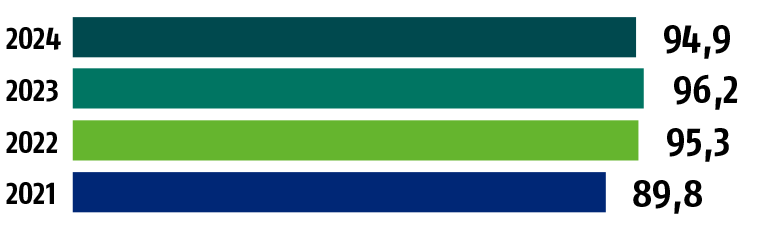 Vuonna 2024 tietojen kattavuus oli 94,9 prosenttia, kun vuonna 2023 kattavuus oli jopa 96,2 prosenttia. Vuonna 2022 kattavuus oli 95,3 prosenttia ja vuonna 2021 kattavuus oli 89,8 prosenttia.