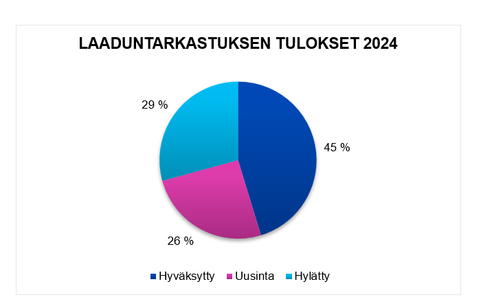 Vuoden 2024 laaduntarkastuksista 48 tilintarkastajaa (45 %) sai hyväksytty -tuloksen ja 31 tilintarkastajaa (29 %) sai hylätty -tuloksen. Uusintatarkastuksella jatketaan 27 tilintarkastajan (26 %) laaduntarkastusta. Määriin sisältyvät tilintarkastajat, joilta on tarkastettu PIE- tai julkishallinnon toimeksianto. 12 laaduntarkastukseen määrättyä tilintarkastajaa ei saanut tulospäätöstä tai ratkaisua 31.12.2024 mennessä, koska heidän laaduntarkastuksensa oli siinä vaiheessa keskeneräinen.