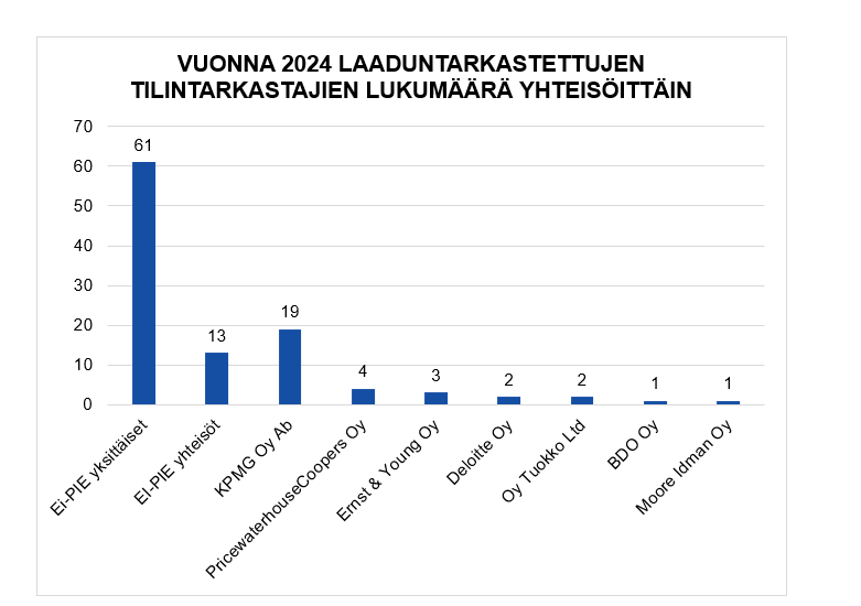 Vuonna 2024 laaduntarkastuksen tulospäätöksen tai ratkaisun saaneista 106 tilintarkastajasta 32 toimi PIE-tilintarkastusyhteisöissä tai saman ketjun yhteisössä, 61 tilintarkastajaa toimi yksin ja 13 tilintarkastajaa toimi muissa tilintarkastusyhteisöissä. PIE-tilintarkastusyhteisöistä KPMG Oy:ssä työskenteli 19 tarkastetuista tilintarkastajista, PricewaterhouseCoopers Oy:ssä neljä, Ernst & Young Oy:ssä kolme, Deloitte Oy:ssä kaksi, Oy Tuokko Ltd:ssä kaksi, BDO Oy:ssä yksi ja Moore Idman Oy:ssä yksi.