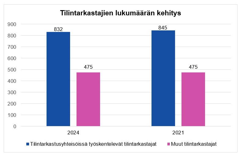 Suomessa oli 30.6.2024 tilintarkastajarekisterin mukaan 1 307 tilintarkastajana toimivaa luonnollista henkilöä (1 320 henkilöä vuonna 2021). Vuoteen 2021 verrattuna tilintarkastajien lukumäärä laski 13 henkilön verran. Tilintarkastusyhteisöjen antamien tietojen mukaan 832 henkilöä toimii jonkin tilintarkastusyhteisön palveluksessa (845 henkilöä vuonna 2021) ja loput 475 tilintarkastajaa toimivat tilintarkastusyhteisöjen ulkopuolella (475 henkilöä vuonna 2021).