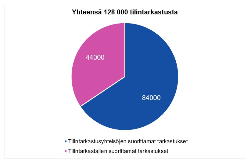Valvontatietoilmoitusten perusteella tilintarkastusyhteisöt tekevät valtaosan eli noin 84 000 tilintarkastusta ja muut noin 44 000 tilintarkastusta.