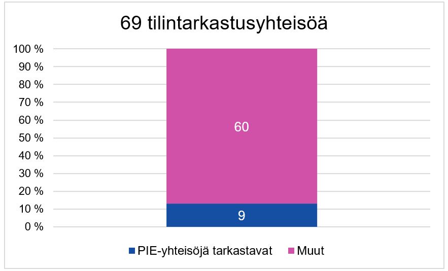 Tilintarkastusyhteisöistä yhdeksällä on Suomessa tilintarkastusasiakkaina PIE-yhteisö tai -yhteisöjä. Yhteensä tilintarkastusyhteisöjä oli 69.