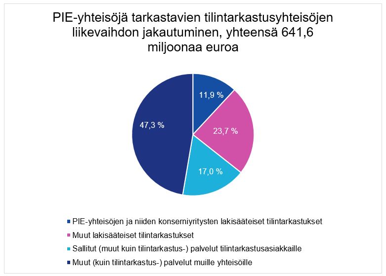 Tilintarkastusmarkkinoita voidaan tarkastella myös tilintarkastusyhteisöjen PIE- liikevaihdolla, joka on saatu tilintarkastusyhteisöjen avoimuusraporteilta. Liikevaihdossa ovat PIE-yhteisöjen ja yhteisöjen, jotka kuuluvat konserniin, jonka emoyritys on PIE-yhteisö, tilinpäätösten ja konsernitilinpäätösten lakisääteisestä tilintarkastuksesta saadut palkkiot.