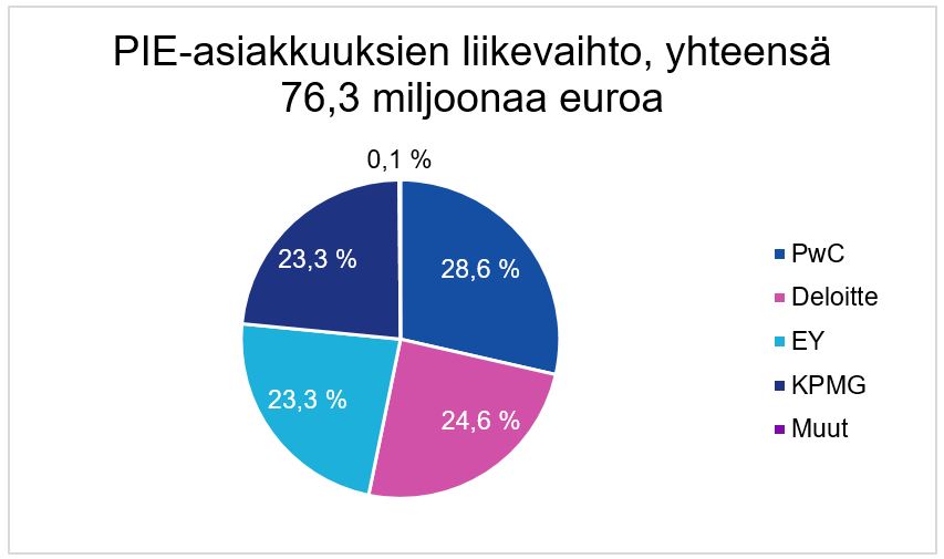 PIE-sektorilla toimivien tilintarkastusyhteisöjen koko liikevaihto jakautuu tilintarkastusyhteisöjen avoimuusraporttien mukaan seuraavasti: