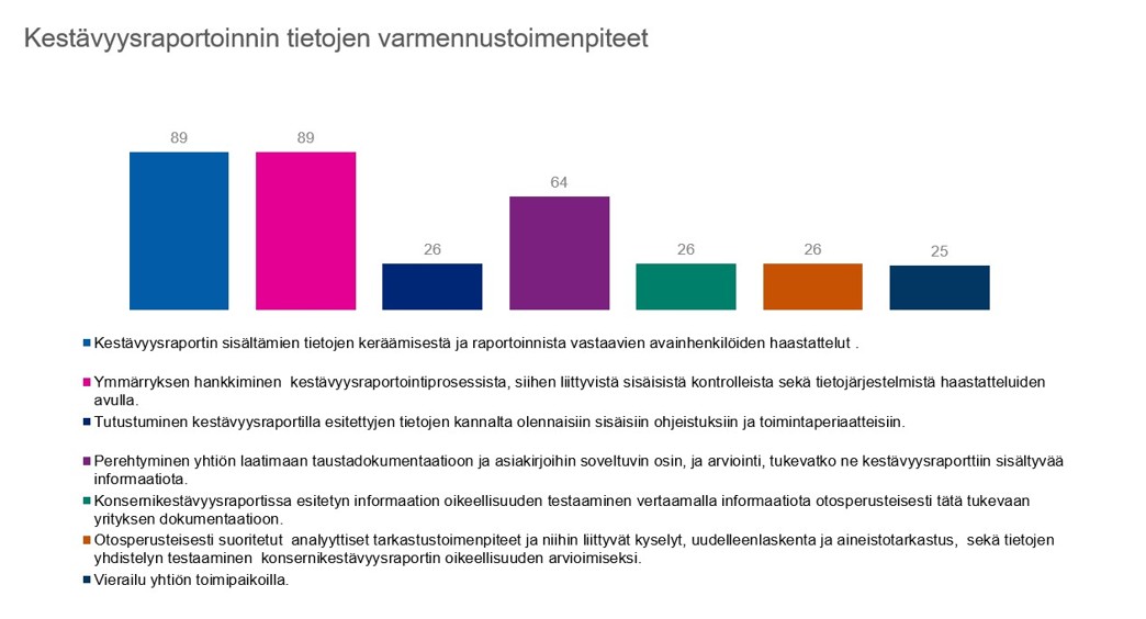 Kaikissa varmennuskertomuksissa mainittiin raportoitujen tietojen varmennustoimenpiteenä kestävyysraportin tietojen keräämisestä ja raportoinnista vastaavien avainhenkilöiden haastattelut sekä ymmärryksen hankkiminen kestävyysraportoinnin prosessista ja siihen liittyvistä sisäisistä kontrolleista.