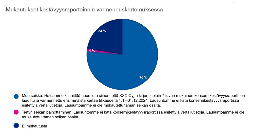 Pääosaan (77,5 %) varmennuskertomuksista on sisällytetty muuta seikkaa koskeva tai painottava kappale, jolla kiinnitetään lukijan huomio siihen, että lausunto ei kata konsernikestävyysraportissa esitettyjä vertailutietoja.