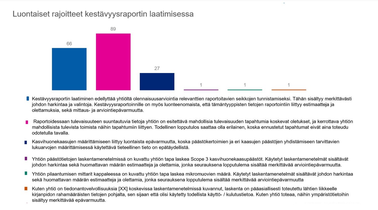 Kestävyysraportin laatimiseen liittyy luontaisia rajoitteita, esimerkiksi johdon harkintaa ja ennusteita, joita kestävyysraportointitarkastajan voi olla haastavaa tai mahdotonta varmentaa. Tämän vuoksi kaikissa tarkastelluissa varmennuskertomuksissa on esitetty kuvaus merkittävistä kestävyysraportin laatimiseen liittyvistä luontaisista rajoitteista.