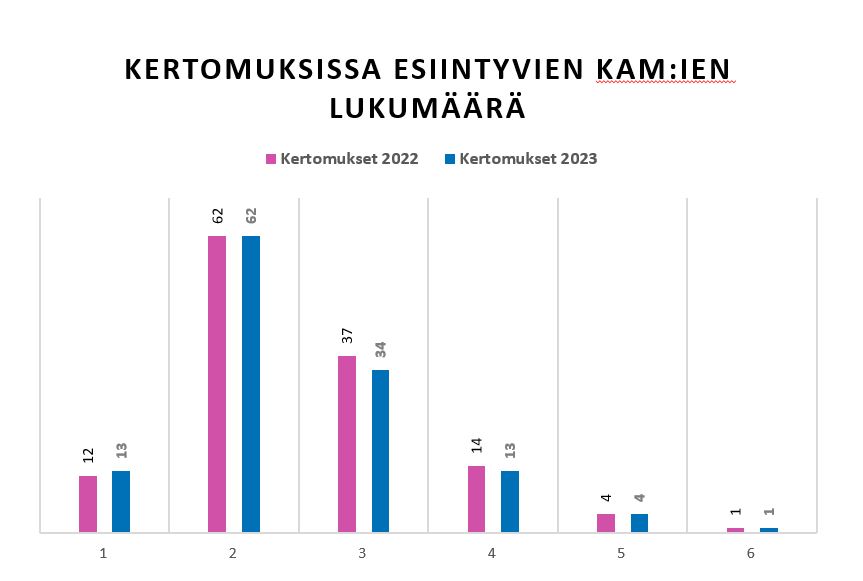 Vuonna 2023 raportoitiin yhteensä 317 KAMia (329 vuonna 2022). 59,1 % vuoden 2023 (56,9 % vuoden 2022) kertomuksista sisälsi enintään kaksi tilintarkastuksen kannalta keskeistä seikkaa.