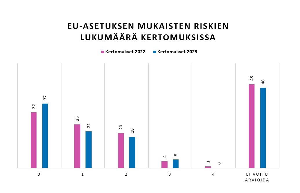 Kaikkia KAMien yhteydessä tarkasteltuja tilintarkastuskertomuksia ei voitu hyödyntää EU-asetuksen mukaisten riskien tutkimisessa. 43 kertomuksessa (44 kertomuksessa vuonna 2022) oli todettu, että EU-asetuksen 537/2014 10 artiklan 2 c -kohdan mukaiset merkittävät olennaisen virheellisyyden riskit sisältyvät kuvattuihin tilintarkastuksen kannalta keskeisiin seikkoihin, eikä niitä siksi pystytty yksilöimään. Lisäksi kolmessa kertomuksessa (neljässä kertomuksessa vuonna 2022) ei ollut mainittu EU-asetuksen mukaisia riskejä tai niitä ei ollut esitetty niin yksiselitteisesti, että ne olisi voitu ottaa mukaan tarkasteluun.