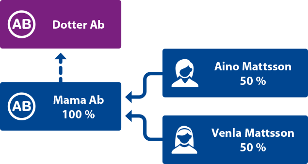 Moderbolaget Mama Ab äger 100 procent av dotterbolaget Dotter Ab. Aino Mattsson och Venla Mattsson äger moderbolaget Mama Ab med andelar på 50 procent. De är förmånstagare i moderbolaget. Dotterbolaget har inga förmånstagare.