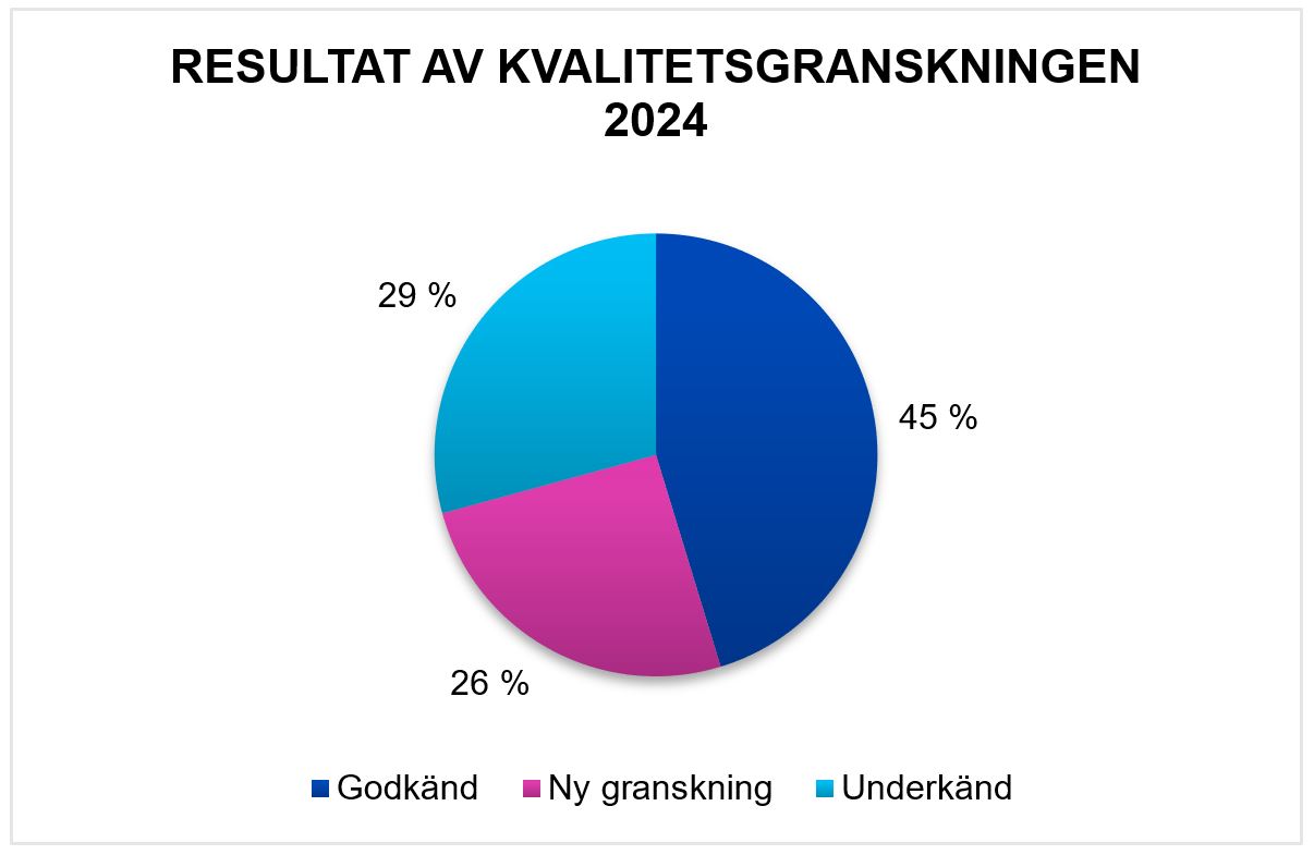 Av kvalitetsgranskningarna 2024 fick 48 revisorer (45 procent) godkänt och 31 revisorer (29 procent) underkänt. Med en ny granskning fortsätter kvalitetsgranskningen av 27 revisorer (26 procent). I antalen ingår revisorer som haft PIE-uppdrag eller uppdrag inom den offentliga förvaltningen. Tolv revisorer som förordnats till kvalitetsgranskning fick inget resultatbeslut eller avgörande före 31.12.2024, eftersom deras kvalitetsgranskning i det skedet fortfarande var på hälft.