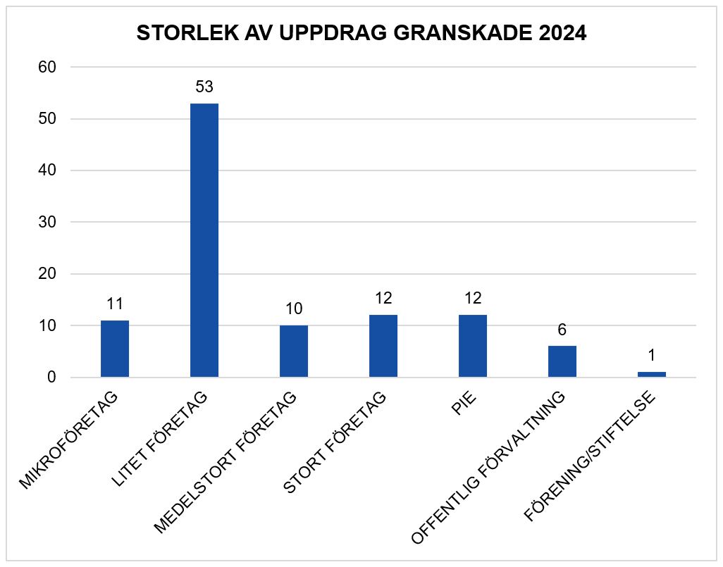 De genomgångna uppdragen gällde samfund och stiftelser inom olika branscher och den offentliga förvaltningen. Storleken på uppdragen varierade från mikroföretag till storföretag och PIE-bolag samt olika stora aktörer inom den offentliga förvaltningen (storleksklasser som definieras i bokföringslagen).
