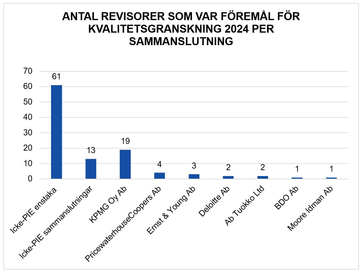 Av de 106 revisorer som fick resultatbeslutet eller avgörandet för kvalitetsgranskningen 2024 arbetade 32 i PIE-revisionssammanslutningar eller i en sammanslutning i samma kedja. 61 revisorer arbetade ensamma och 13 arbetade i andra revisionssammanslutningar. Av PIE-revisionssammanslutningarna arbetade 19 av de granskade revisorerna vid KPMG Oy Ab, 4 vid PricewaterhouseCoopers Ab, 3 vid Ernst & Young Ab 2 vid Deloitte Ab, 2 vid Oy Tuokko Ltd, 1 vid BDO Oy och 1 vid Moore Idman Oy.