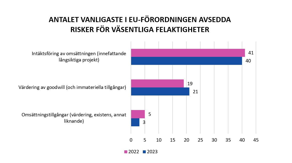 De tre vanligaste i EU-förordningen avsedda viktiga riskerna för väsentliga felaktigheter är intäktsföring av omsättningen, värdering av goodwill (och immateriella tillgångar), värdering och existens av omsättningstillgångar samt dithörande reserver. De här utgör 88,9 % (80,2 % år 2022) av de identifierade i EU-förordningen avsedda viktiga riskerna för väsentliga felaktigheter.