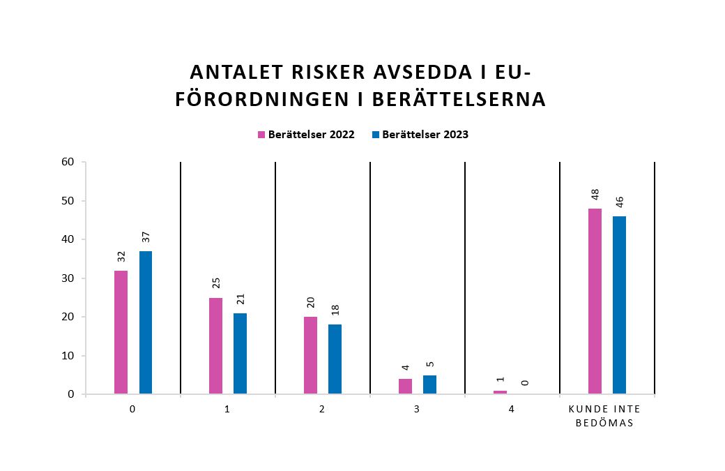Alla revisionsberättelser som hade granskats i samband med KAM-områden kunde inte användas i undersökningen av riskerna avsedda i EU-förordningen. I 43 berättelser (44 berättelser år 2022) konstaterades att de i artikel 10.2 c i EU-förordningen 537/2014 avsedda viktigaste riskerna för väsentliga felaktigheter ingår i de för revisionen särskilt betydelsefulla områden som beskrivits, och de kunde därför inte identifieras. I tre berättelser (fyra berättelser år 2022) hade inte riskerna avsedda i EU-förordningen nämnts överhuvudtaget eller de hade inte framförts så entydigt att de kunde ha tagits med i granskningen.