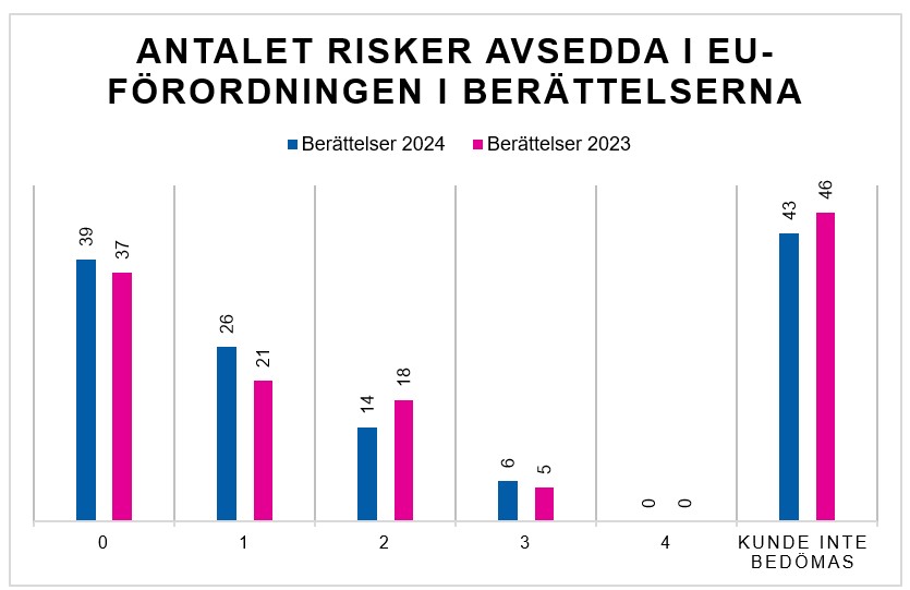 Alla revisionsberättelser som hade granskats i samband med KAM-områden kunde inte användas i undersökningen av riskerna avsedda i EU-förordningen. I 40 berättelser (43 berättelser år 2023) konstaterades att de i artikel 10.2 c i EU-förordningen 537/2014 avsedda viktigaste riskerna för väsentliga felaktigheter ingår i de för revisionen särskilt betydelsefulla områden som beskrivits, och de kunde därför inte identifieras. I tre berättelser (tre berättelser år 2023) hade inte riskerna avsedda i EU-förordningen nämnts överhuvudtaget eller de hade inte framförts så entydigt att de kunde ha tagits med i granskningen.