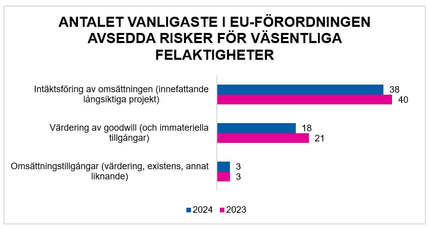 De tre vanligaste i EU-förordningen avsedda viktiga riskerna för väsentliga felaktigheter är intäktsföring av omsättningen, värdering av goodwill (och immateriella tillgångar), värdering och existens av omsättningstillgångar samt dithörande reserver. De här utgör 81,9 % (88,9 % år 2023) av de identifierade i EU-förordningen avsedda viktiga riskerna för väsentliga felaktigheter.