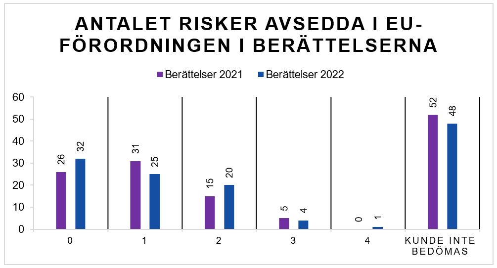 Alla revisionsberättelser som hade granskats i samband med KAM-områden kunde inte användas i undersökningen av riskerna avsedda i EU-förordningen. I 44 berättelser (49 berättelser år 2021) konstaterades, att de i Artikel 10.2 c i EU-förordningen 537/2014 avsedda viktigaste riskerna för väsentliga felaktigheter ingår i de för revisionen särskilt betydelsefulla områden som beskrivits, och de kunde därför inte identifieras. I fyra berättelser (tre berättelser år 2021) hade inte riskerna avsedda i EU-förordningen nämnts överhuvudtaget eller de hade inte framförts så entydigt att de kunde ha tagits med i granskningen.