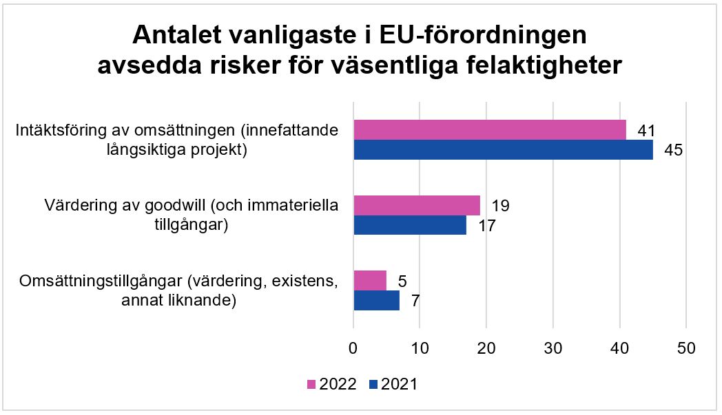 De tre vanligaste i EU-förordningen avsedda viktiga riskerna för väsentliga felaktigheter är intäktsföring av omsättningen, värdering av goodwill (och immateriella tillgångar), värdering och existens av omsättningstillgångar samt dithörande reserver. De här utgör 80,2 % (90,8 % år 2021) av de identifierade i EU-förordningen avsedda viktiga riskerna för väsentliga felaktigheter.